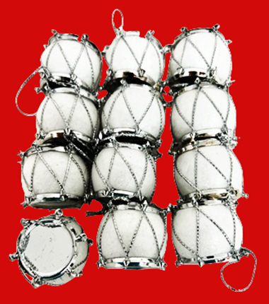 Set 12 decoratiuni cu agatatoare - tobe albe cu sclipici, ideale pentru a decora diferite aranjamente specifice sarbatorilor de iarna.